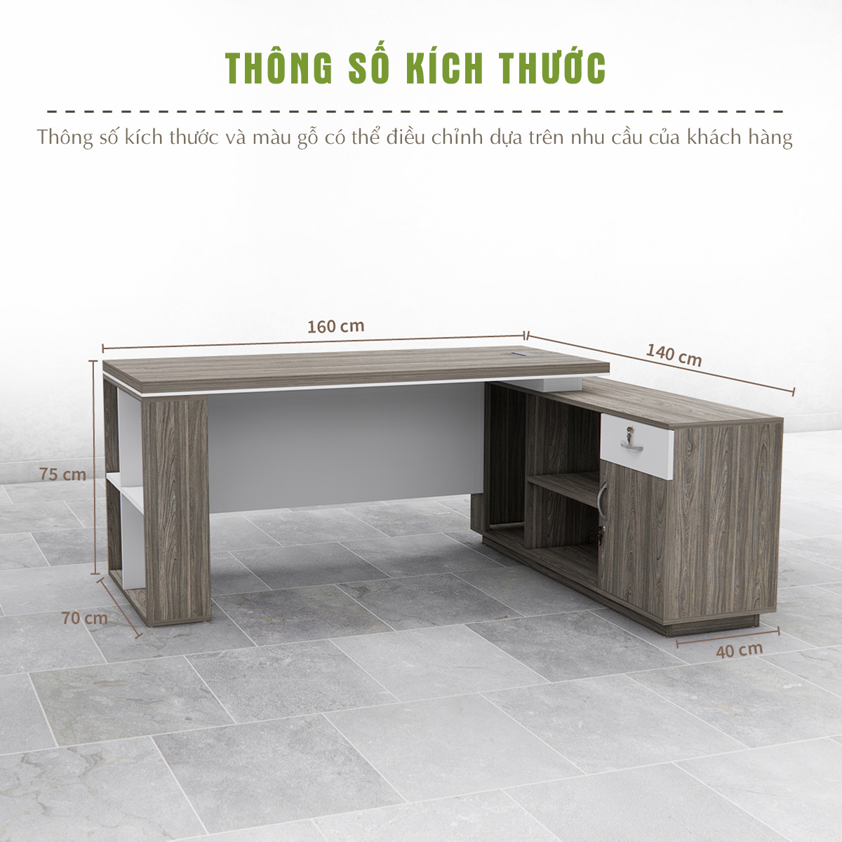 Bề mặt bàn được làm từ chất liệu gỗ MFC cao cấp, có khả năng chống trầy xước và chống ẩm, giúp bàn luôn bền đẹp theo thời gian. Chất liệu này không chỉ mang đến vẻ ngoài tinh tế mà còn đảm bảo độ bền, phù hợp với nhu cầu sử dụng lâu dài của văn phòng lãnh đạo.