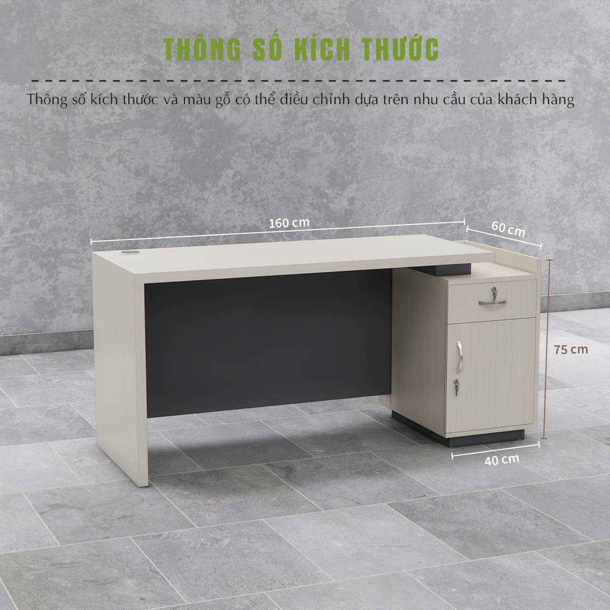 Bàn được làm từ gỗ MFC chất lượng cao, có khả năng chống trầy xước và chống thấm nước, giúp duy trì độ bền lâu dài và dễ dàng vệ sinh. Chất liệu này không chỉ bền bỉ mà còn tạo nên vẻ đẹp tự nhiên, hài hòa với không gian làm việc cao cấp.