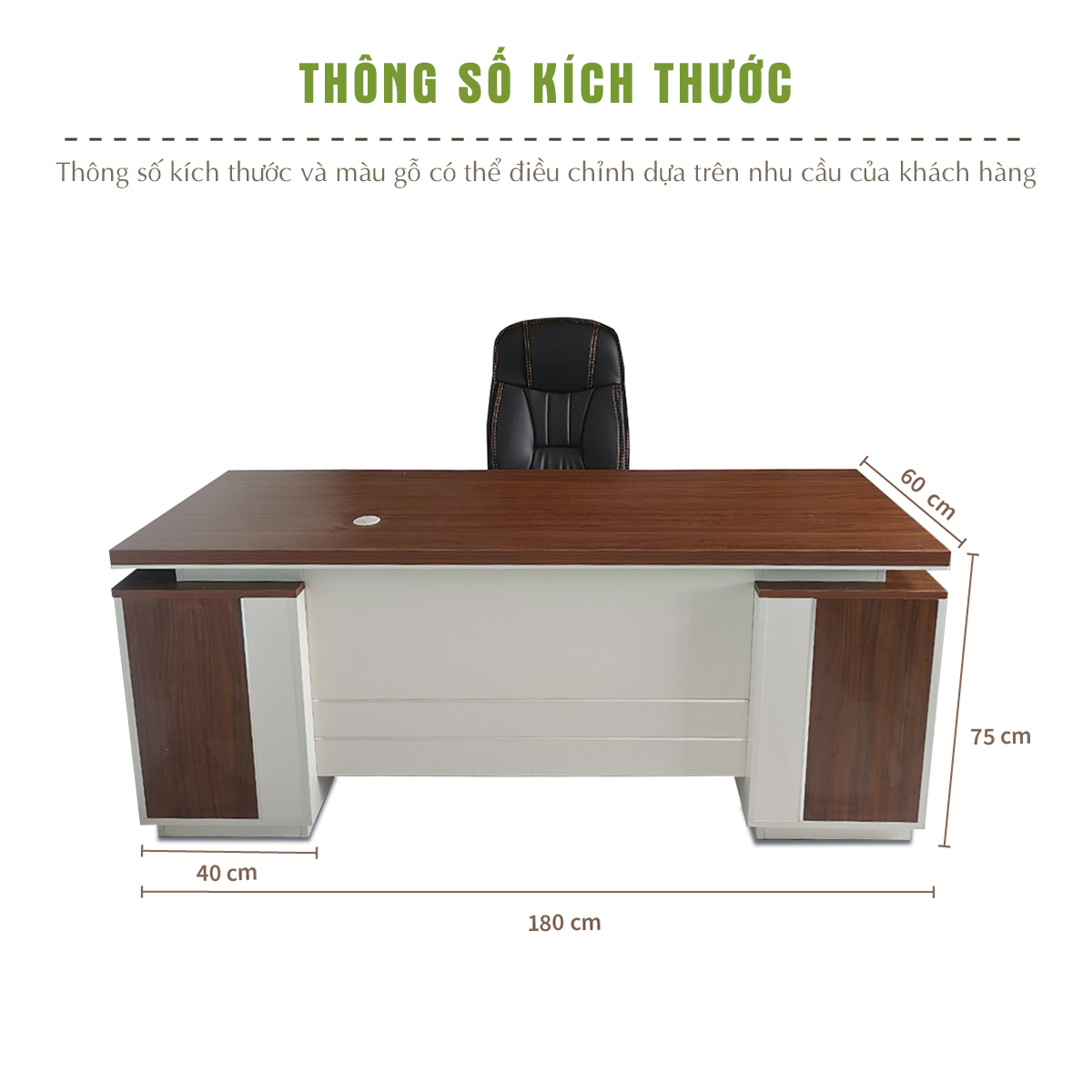 Mặt bàn rộng rãi được làm từ chất liệu gỗ công nghiệp cao cấp, có khả năng chống trầy xước và thấm nước, dễ dàng vệ sinh và bảo quản. Thiết kế mặt bàn với các đường nét tinh xảo, kết hợp màu sắc trang nhã, tạo nên không gian làm việc thanh lịch và chuyên nghiệp.