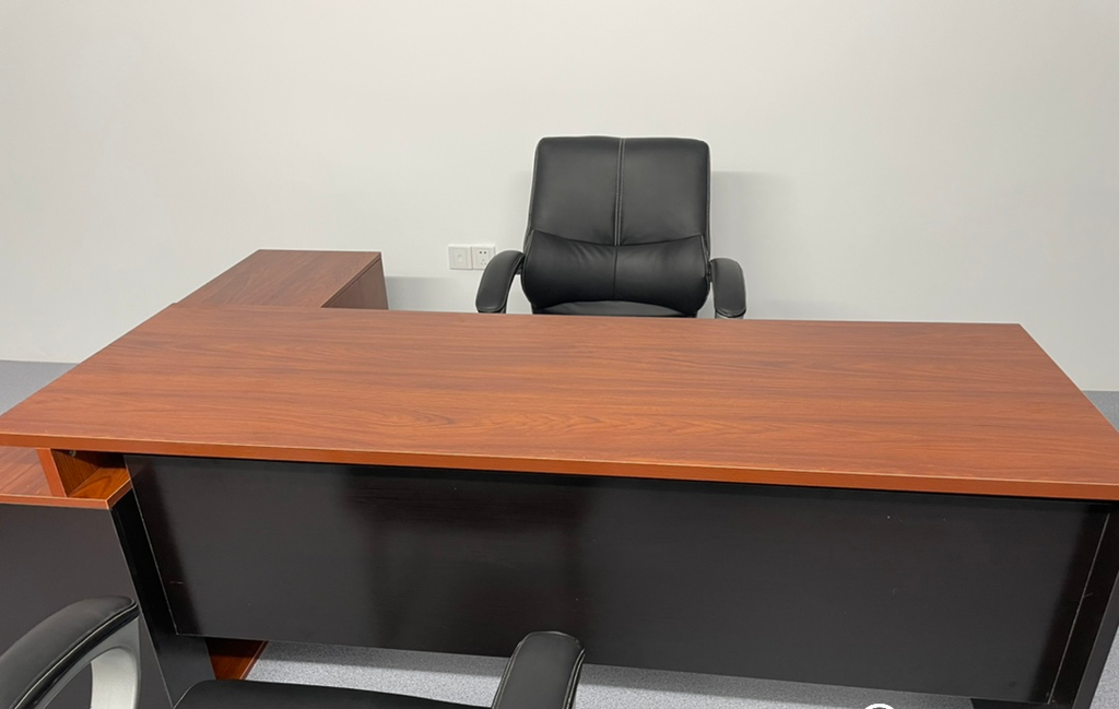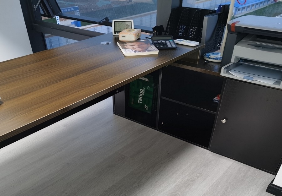 Điểm nhấn của bàn là sở hữu màu vân gỗ sang trọng, đẹp mắt. Đi kèm với bàn là tủ phụ cùng màu vân, kết hợp tạo nên tổng thể hoàn hảo cho phòng làm việc lãnh đạo.