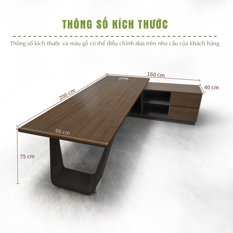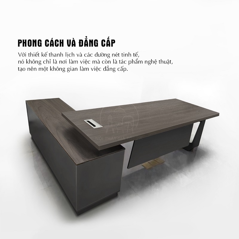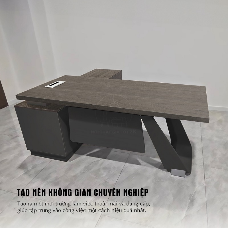 Bàn Giám Đốc này không chỉ đẹp mắt, mà còn tiện ích với các ngăn kéo và kệ đựng linh hoạt. Điều này giúp bạn tổ chức văn phòng của mình một cách thông minh và hiệu quả.