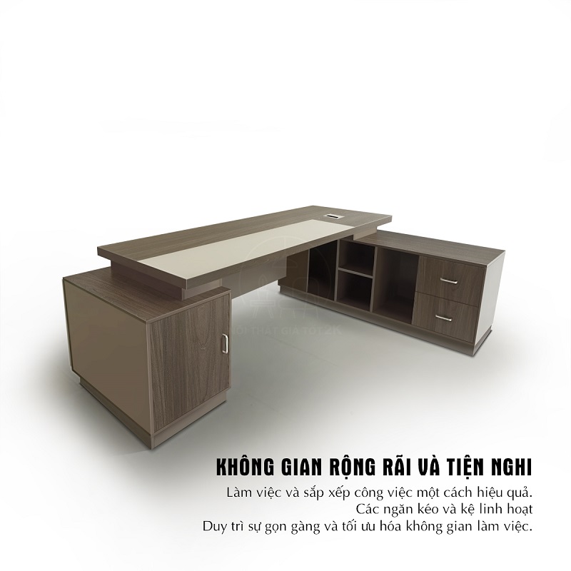 Bàn có không gian rộng rãi để làm việc và tổ chức công việc một cách hiệu quả. Các ngăn kéo và kệ linh hoạt giúp bạn duy trì sự gọn gàng và tối ưu hóa không gian làm việc.