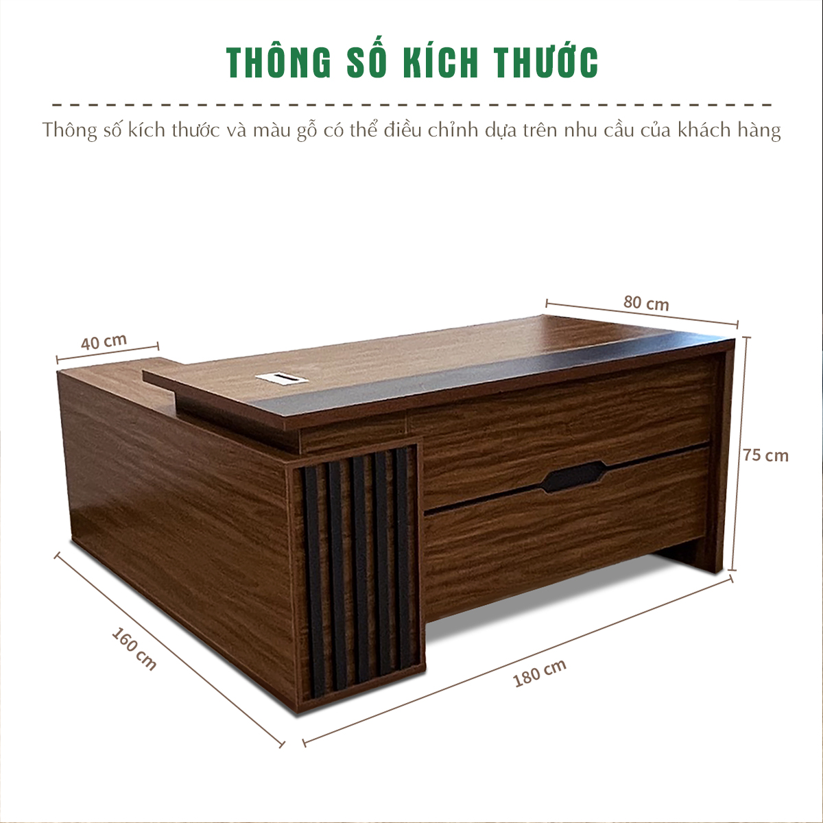 Bàn Giám Đốc SN02-V là sự lựa chọn hoàn hảo với thiết kế tinh tế và chất liệu cao cấp. Với màu sắc vân gỗ tùy chọn, chất liệu gỗ MFC chống ẩm phủ melamine, và bề mặt chống trầy xước không thấm nước, sản phẩm không chỉ đảm bảo tính thẩm mỹ mà còn độ bền vượt trội. Kích thước rộng rãi và các chi tiết gia công bằng máy tự động hiện đại, bàn SN02-V đáp ứng mọi yêu cầu về không gian làm việc chuyên nghiệp và thoải mái. Giao hàng nhanh chóng và bảo hành 12 tháng, bàn Giám Đốc SN02-V chắc chắn sẽ là lựa chọn đáng tin cậy cho văn phòng của bạn.