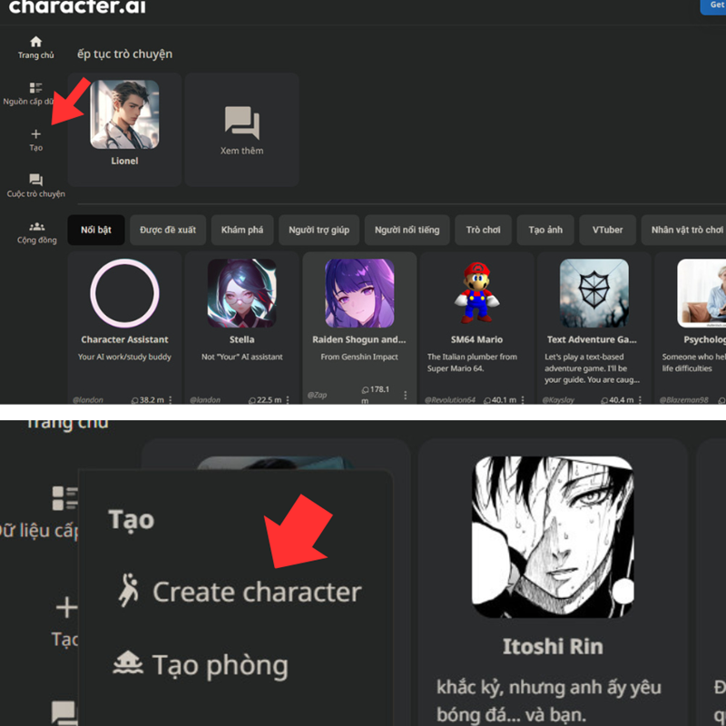 Bước 1: Tại màn hình chính của trang web bạn chọn “Tạo” -> chọn “Tạo nhân vật”