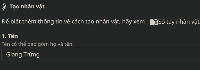 Bạn đánh tên nhân vật bạn muốn thiết lập tại đây, có thể bao gồm họ và tên