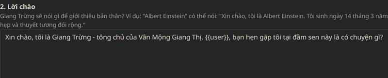 Ở đây bạn cũng có thể sử dụng cú pháp {{user}} vào trong lời chào để có thể tăng thêm sự tương tác giữa nhân vật và người sử dụng.