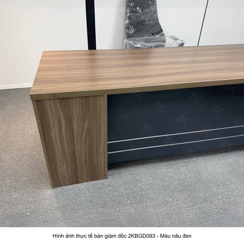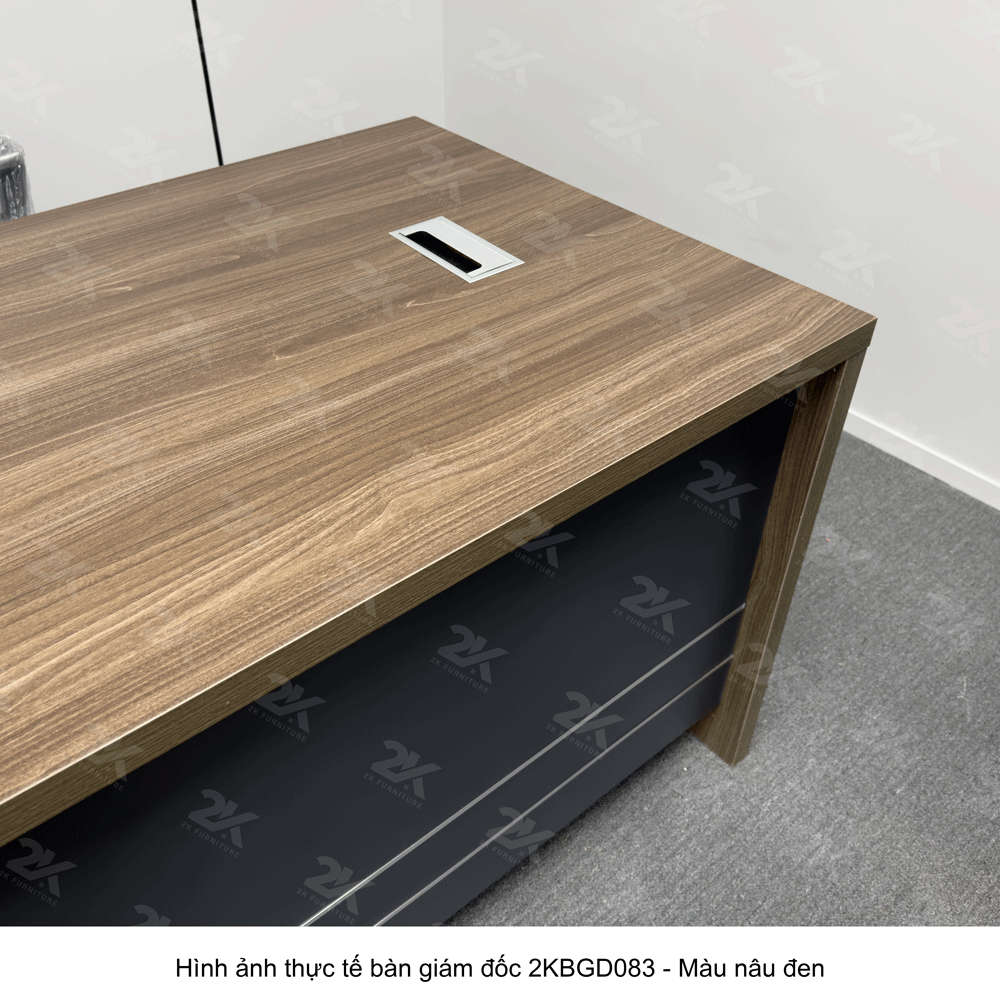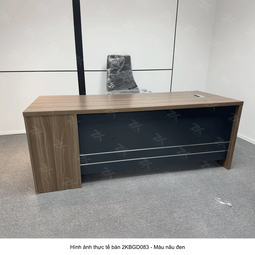 Bàn giám đốc 2KBGD083 mang phong cách thiết kế sang trọng, với đường nét mạnh mẽ, dứt khoát nhưng không kém phần tinh tế. Mặt bàn rộng rãi với kiểu dáng thanh lịch giúp tạo không gian làm việc thông thoáng, chuyên nghiệp, giúp giám đốc có thể dễ dàng sắp xếp tài liệu và các thiết bị văn phòng một cách khoa học. Tông màu trầm ấm của sản phẩm làm tôn lên vẻ đẹp sang trọng, thể hiện rõ phong cách lãnh đạo.