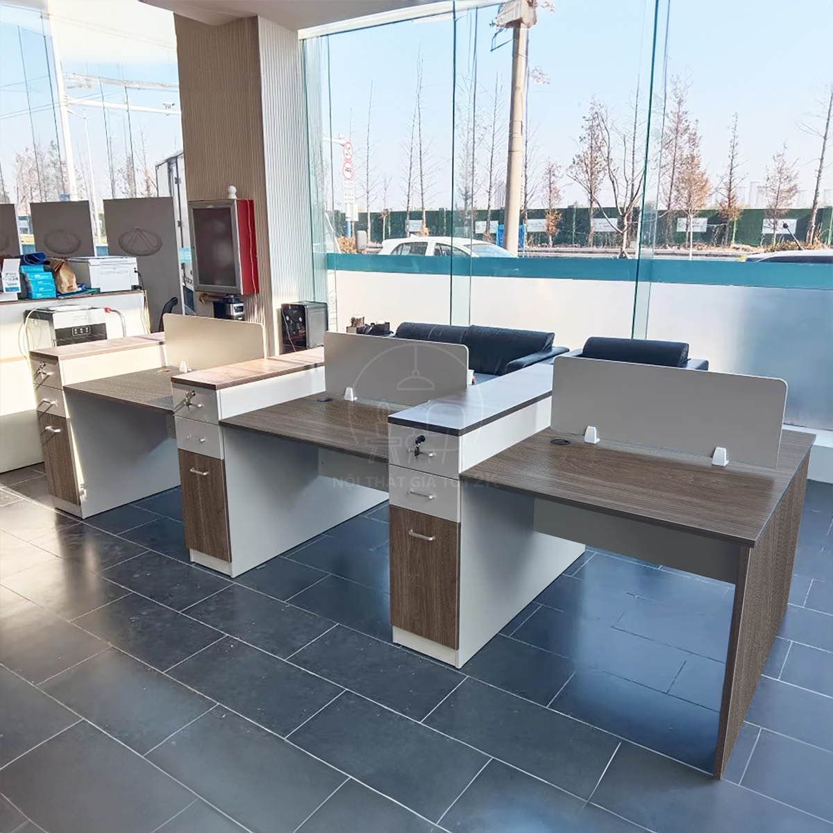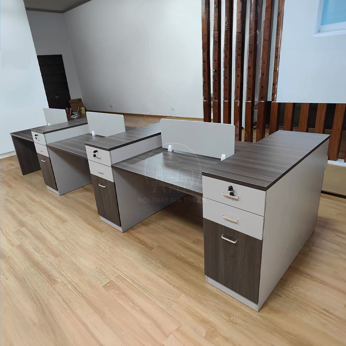 Cụm bàn làm việc 6 người bằng gỗ MFC còn được trang bị các tính năng tiện ích như kệ để đồ, ngăn kéo và hộc tài liệu, giúp bạn dễ dàng tổ chức và lưu trữ các tài liệu công việc một cách gọn gàng và hiệu quả. Thiết kế đơn giản và màu sắc trang nhã của sản phẩm này cũng giúp tạo không gian làm việc thoải mái và tăng tính thẩm mỹ cho văn phòng của bạn.