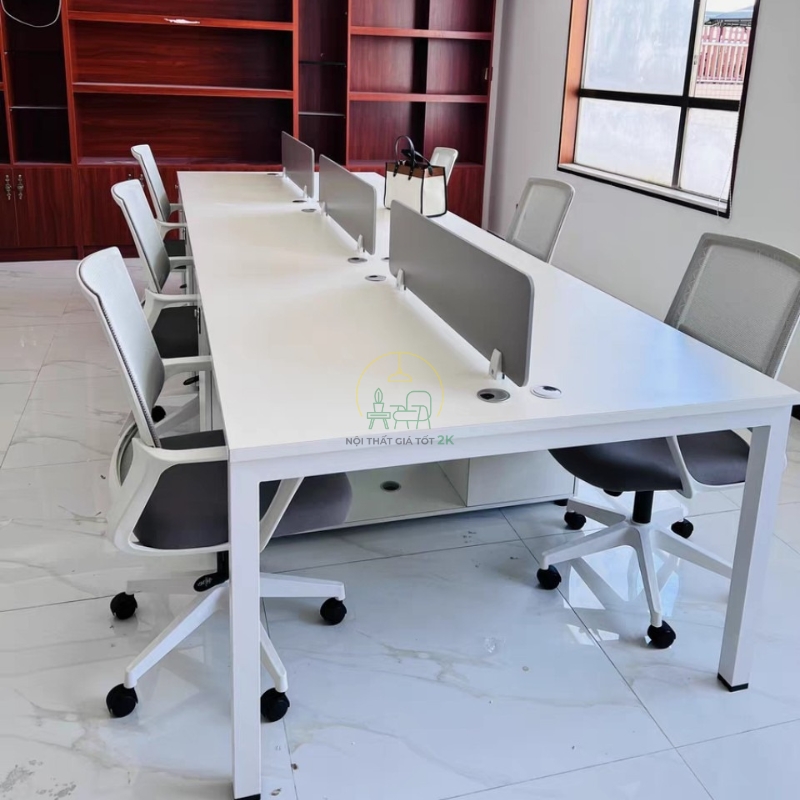 Cụm bàn làm việc 6 người được sử dụng cho các nhóm làm việc lớn hơn hoặc các buổi họp nhóm. Đây là một cách tuyệt vời để tạo ra không gian làm việc hợp tác, tương tác và trao đổi thông tin một cách hiệu quả. Cụm bàn này thường bao gồm một bàn chung lớn hoặc bố trí nhiều bàn nhỏ lại gần nhau theo một hình dạng phù hợp. Bạn có thể sắp xếp cụm bàn theo hình chữ nhật, hình vuông hoặc hình hình ngôi sao để tạo sự kết nối và tương tác giữa các thành viên trong nhóm.