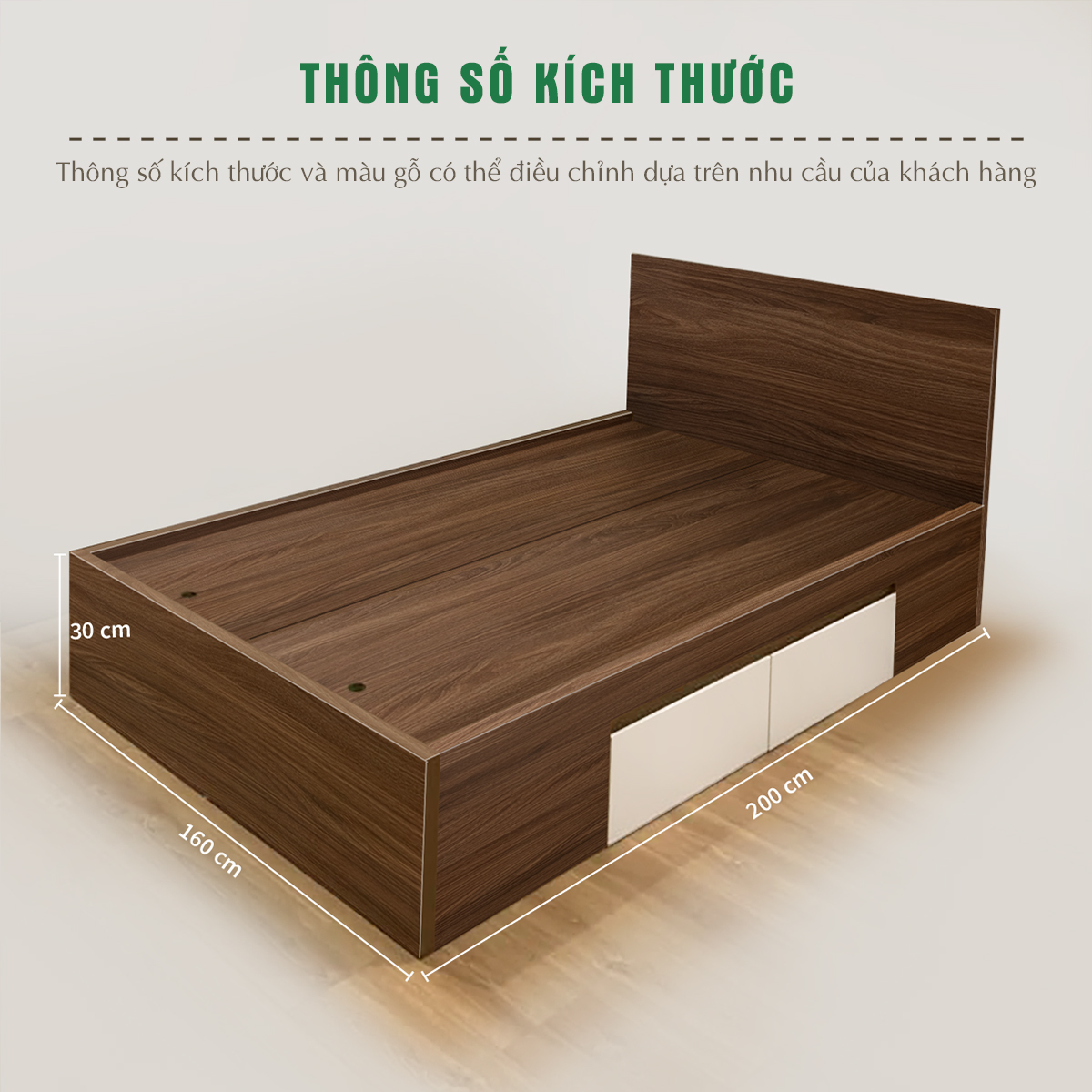 Giường ngủ gỗ công nghiệp GN04M6 được thiết kế với kích thước rộng rãi, phù hợp cho không gian phòng ngủ từ trung bình đến lớn. Với chiều rộng 160cm và chiều dài 200cm, giường này mang lại sự thoải mái và tiện nghi cho người dùng.