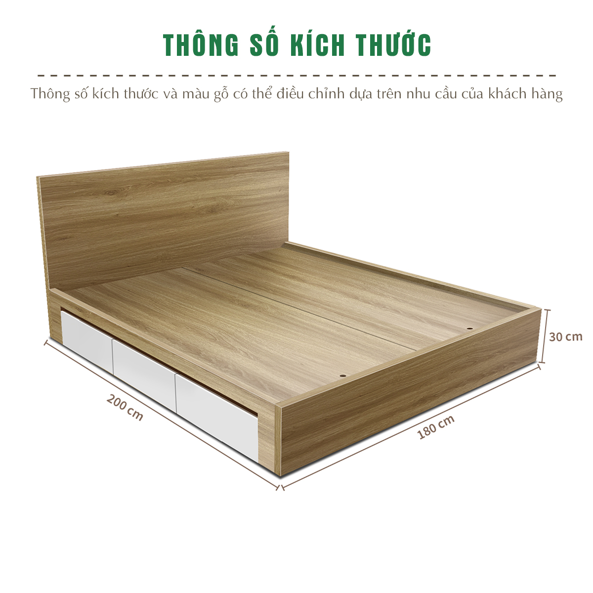 - Bề mặt gỗ phủ melamin có khả năng chống trầy xước, chống thấm nước và dễ dàng vệ sinh, giữ cho giường luôn mới mẻ và sạch sẽ.