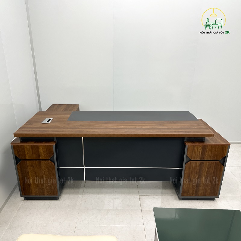 - Bàn giám đốc Mokuzai với thiết kế hiện đại, sang trọng, mặt bàn vân gỗ tự nhiên cao cấp, bền đẹp theo thời gian. Bàn có kích thước rộng rãi, tích hợp hệ thống giá sách và ngăn kéo thông minh, giúp tối ưu hóa không gian lưu trữ.