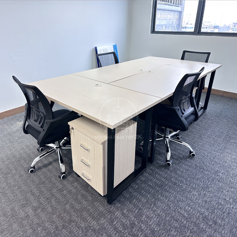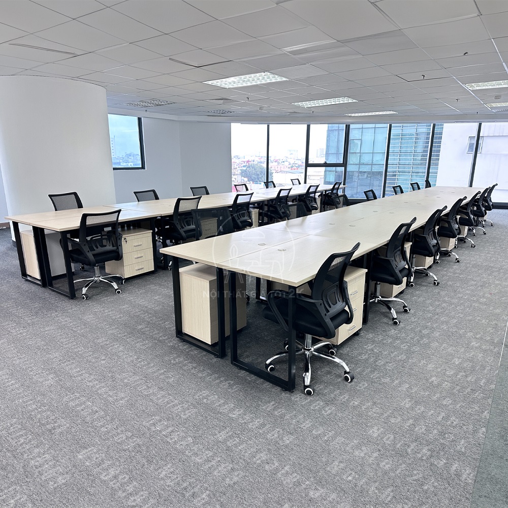 Bố cục phòng được thiết kế khoa học, tối ưu hóa diện tích sử dụng. Bàn làm việc được sắp xếp theo hình chữ U, tạo điều kiện thuận lợi cho giao tiếp và cộng tác giữa các nhân viên. Ghế làm việc được lựa chọn kỹ lưỡng, đảm bảo sự thoải mái và hỗ trợ tốt cho tư thế ngồi.