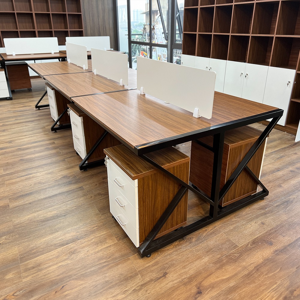 - Tính năng: Cụm bàn làm việc có thể tùy chỉnh theo yêu cầu, với các ngăn kéo và kệ để tài liệu tiện lợi, hỗ trợ tối đa cho công việc hàng ngày.