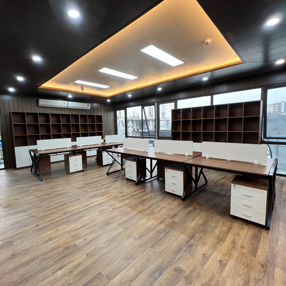 - Thiết kế: Mỗi cụm bàn được bố trí hợp lý, tạo không gian làm việc riêng tư nhưng vẫn đảm bảo sự liên kết giữa các nhân viên. Hệ thống dây điện và cáp mạng được giấu kín, giúp không gian làm việc luôn gọn gàng.