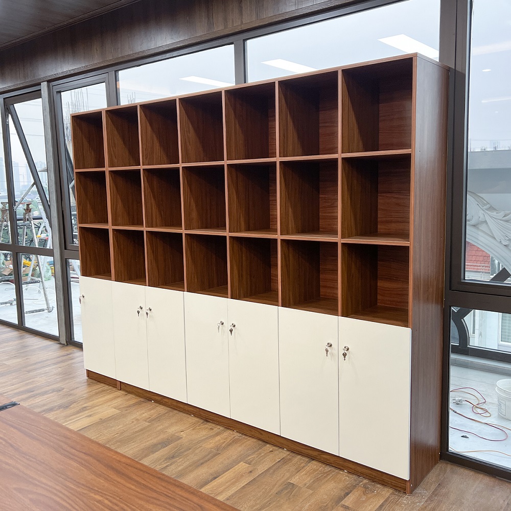 - Chất liệu: Tủ văn phòng được làm từ gỗ MFC cao cấp, bề mặt phủ melamine chống thấm nước và dễ dàng lau chùi.