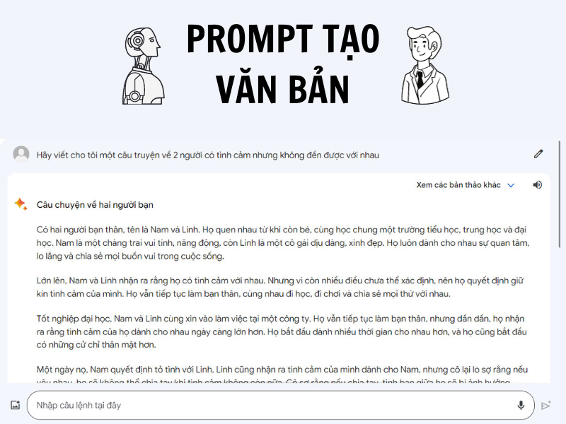 Ví dụ: Prompt: “Hãy viết cho tôi một câu truyện về 2 người có tình cảm nhưng không đến được với nhau. Nam tên Adam, nữ tên Eva…”