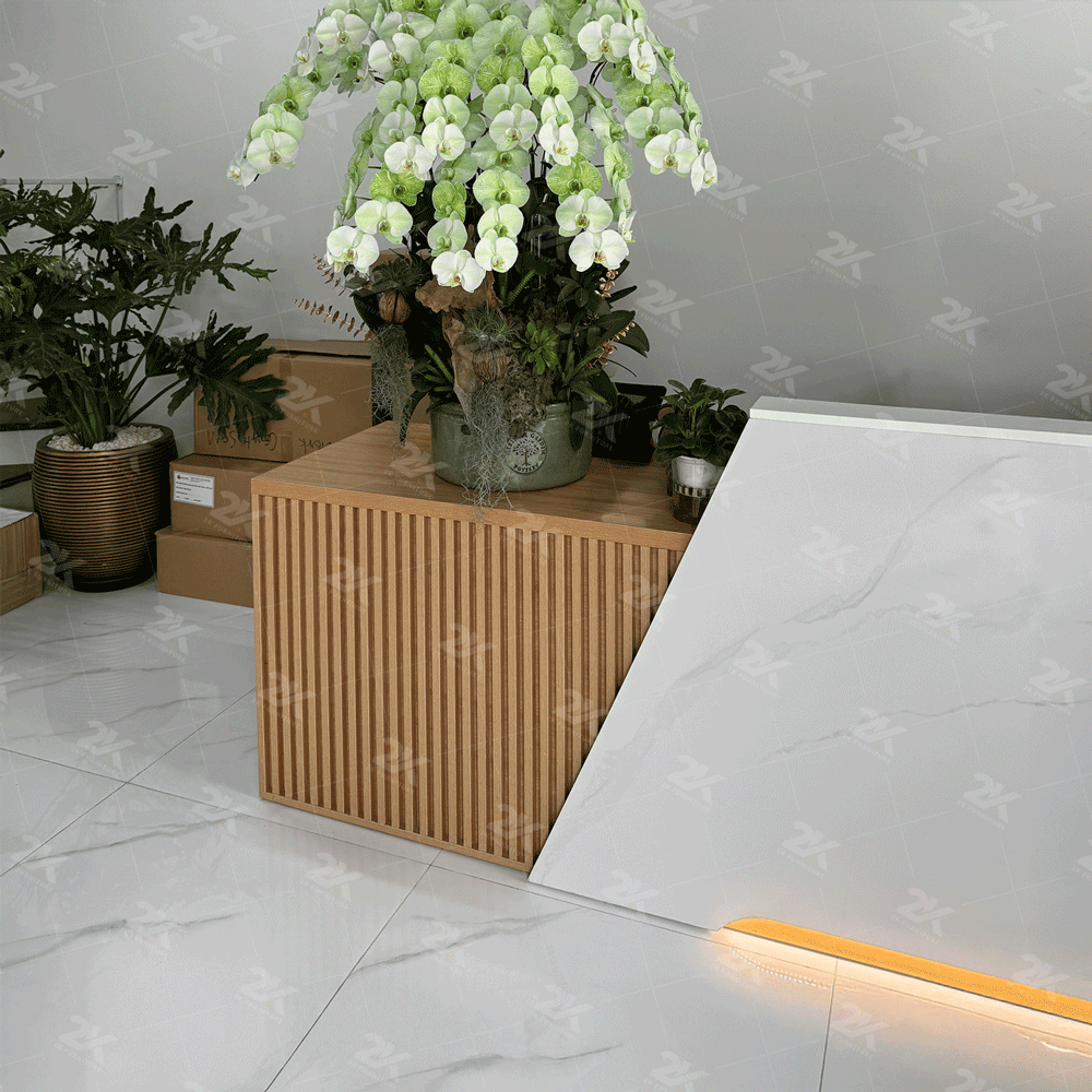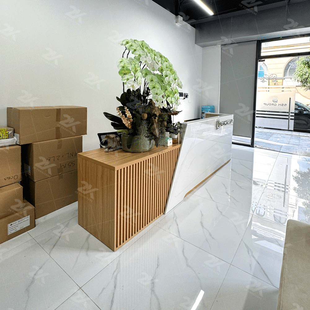 Quầy lễ tân hiện đại, phối màu gỗ – trắng thanh lịch