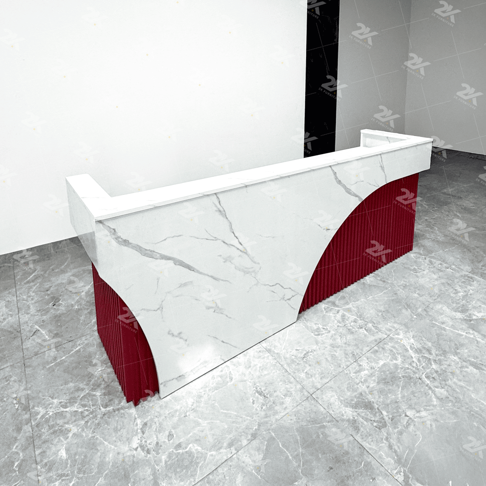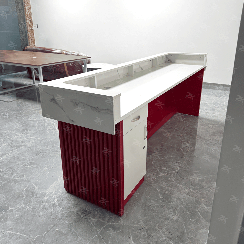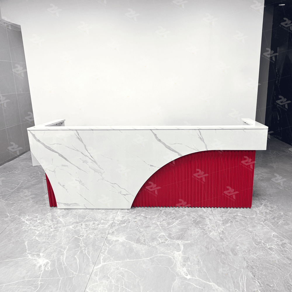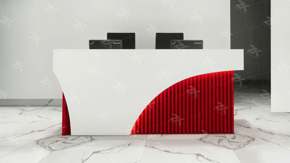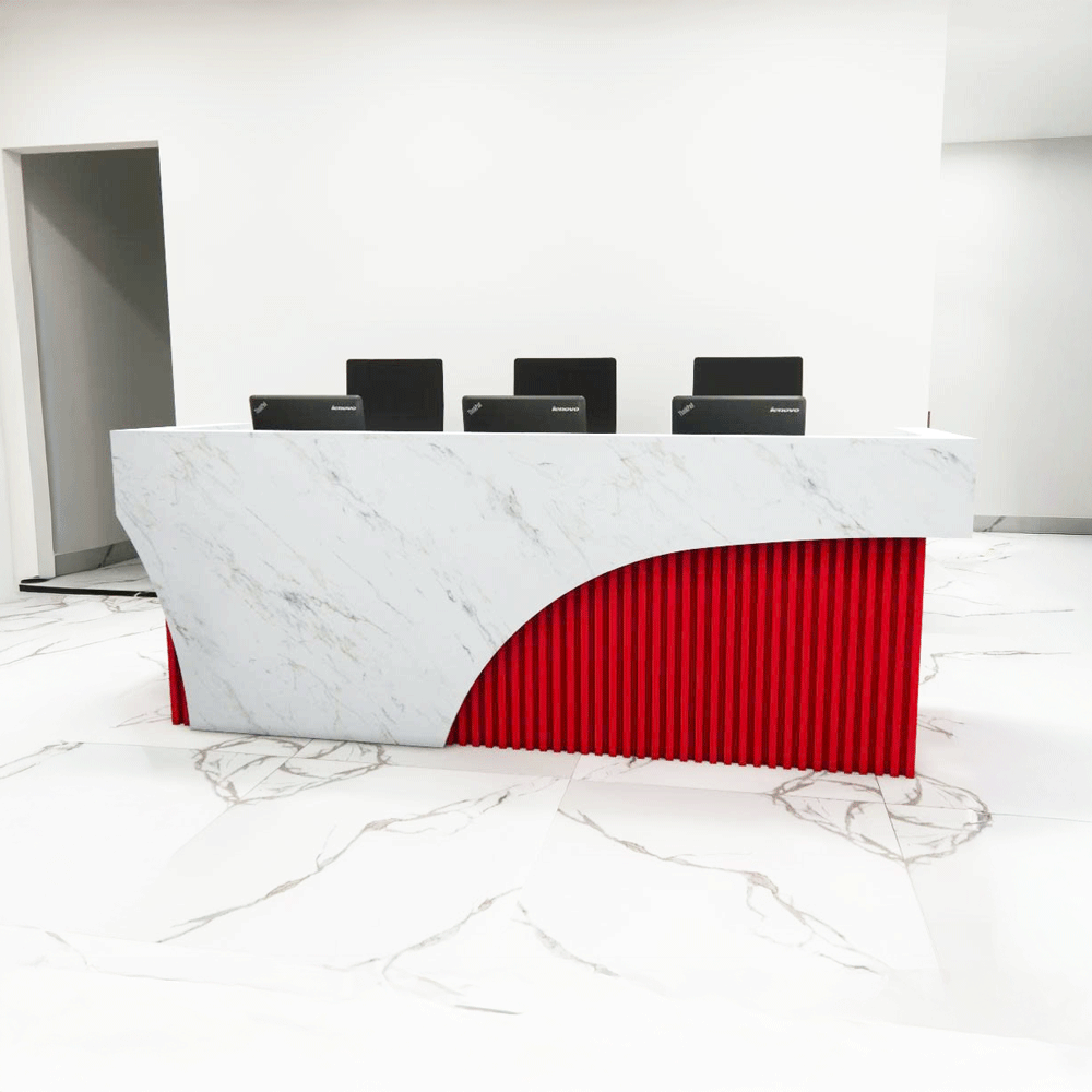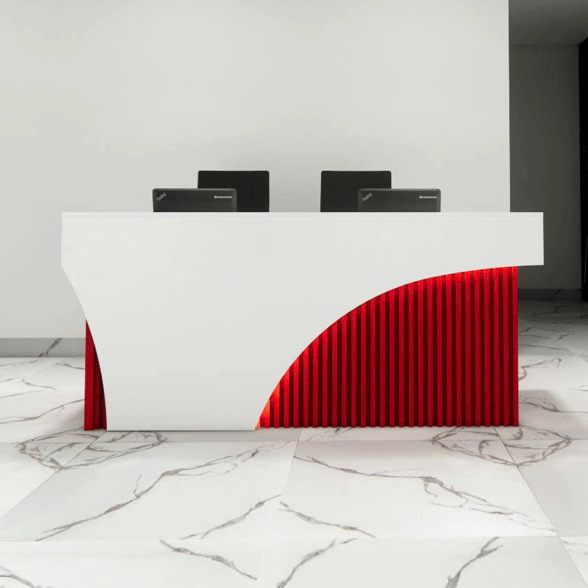 Quầy lễ tân QLTS013 sở hữu thiết kế độc đáo với tông trắng tinh tế kết hợp điểm nhấn đỏ nổi bật, mang lại cảm giác vừa sang trọng vừa trẻ trung.