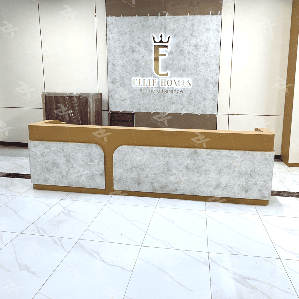 Quầy lễ tân hiện đại, phối màu gỗ – trắng thanh lịch