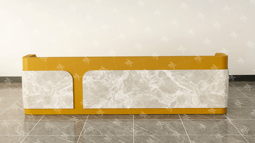Quầy lễ tân QLTS014 là mẫu quầy hiện đại được thiết kế dành riêng cho không gian văn phòng, showroom hoặc khu vực đón tiếp khách hàng. Với gam màu vàng mù tạt nổi bật kết hợp mặt ốp giả đá vân mây sang trọng, sản phẩm mang đến cảm giác vừa chuyên nghiệp vừa ấm cúng cho khu vực lễ tân.