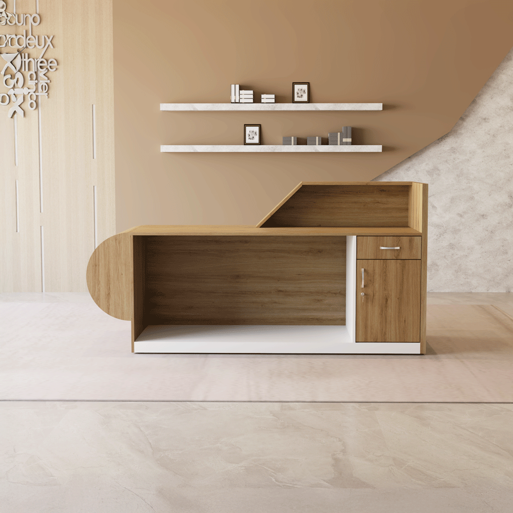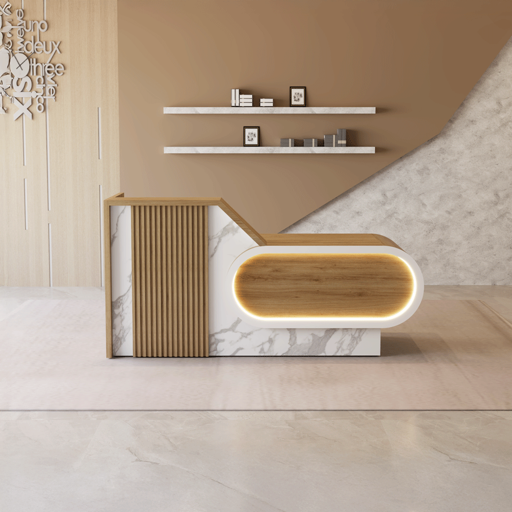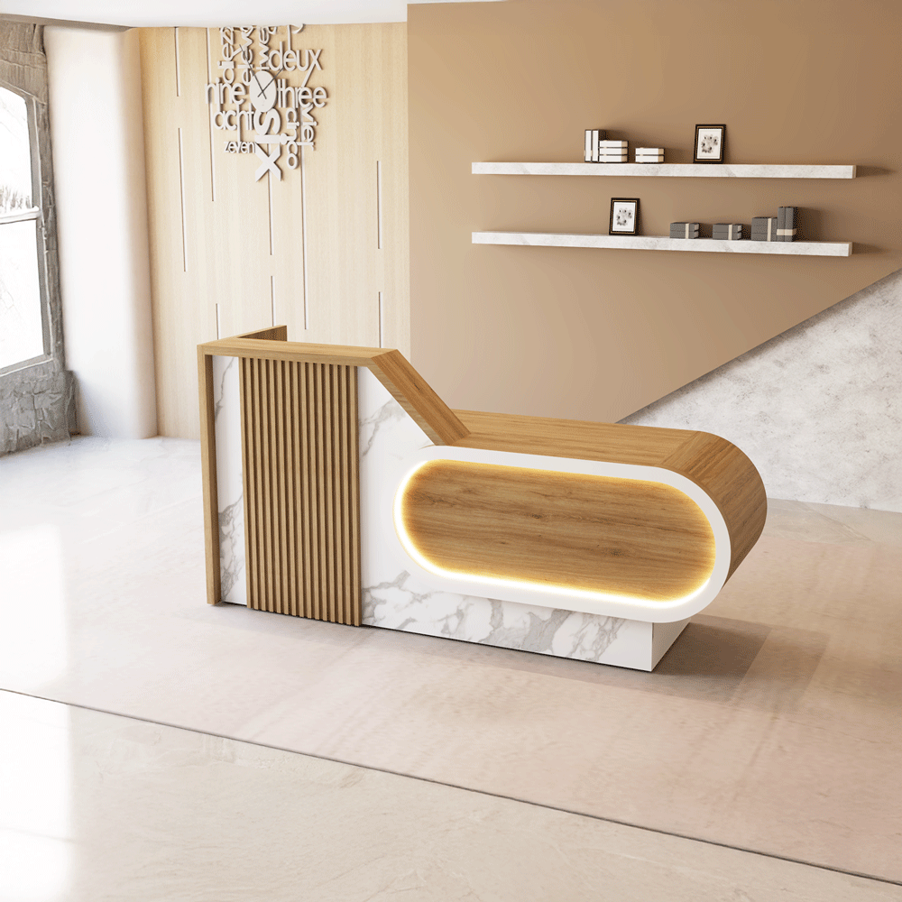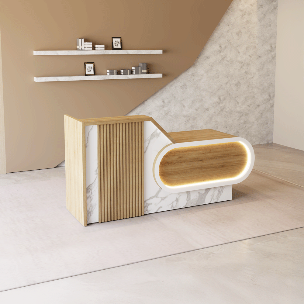 Quầy lễ tân hiện đại, phối màu gỗ – trắng thanh lịch