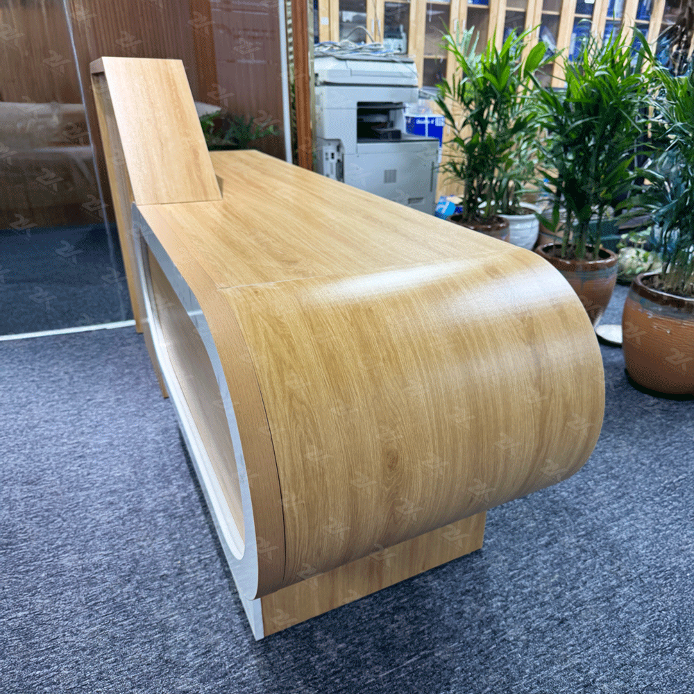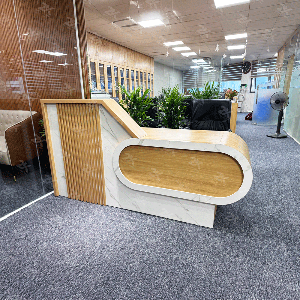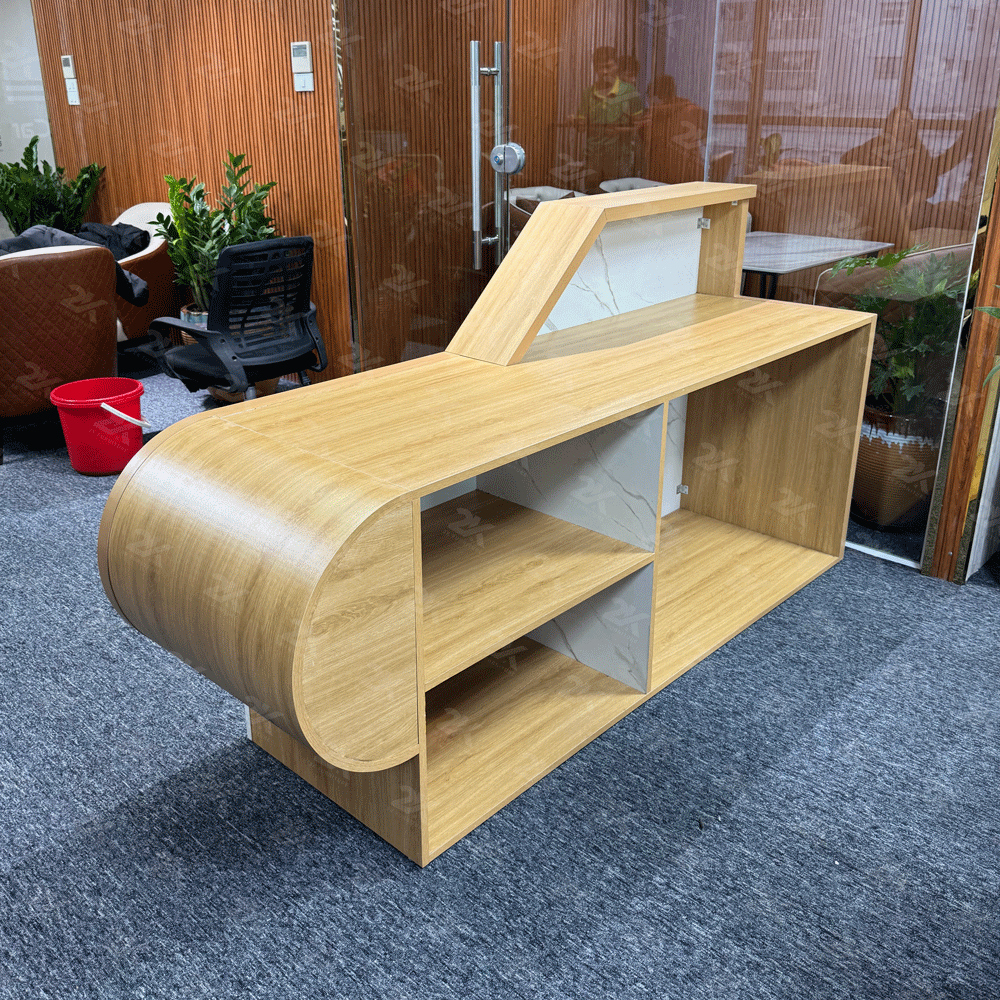 Quầy lễ tân thiết kế hiện đại với kiểu dáng bo cong mềm mại, tạo điểm nhấn ấn tượng cho khu vực sảnh. Sản phẩm phối màu vân gỗ sáng kết hợp trắng vân đá, mang lại cảm giác sang trọng, thân thiện và chuyên nghiệp. Bố cục tiện dụng, không gian bên trong được chia ngăn khoa học, phù hợp cho văn phòng, showroom, spa và các khu tiếp khách.