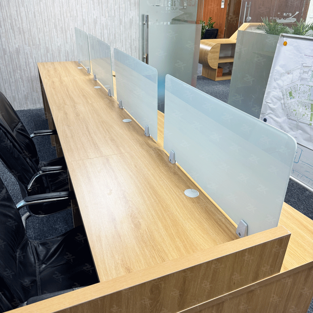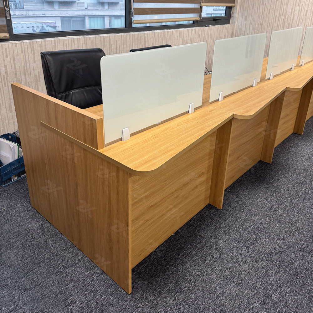 Cụm bàn nhân viên với nhiều kích thước và màu sắc tùy vào sở thích của khách hàng, có thể ngồi từ 6-8 người hay nhiều hơn nếu như muốn thiết kế theo yêu cầu , gỗ MFC kháng ẩm kháng nước, chịu được nhiệt , thiết kế vách ngăn kính ở giữa đảm bảo sự riêng tư.