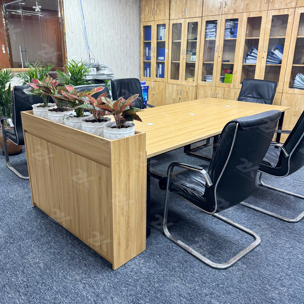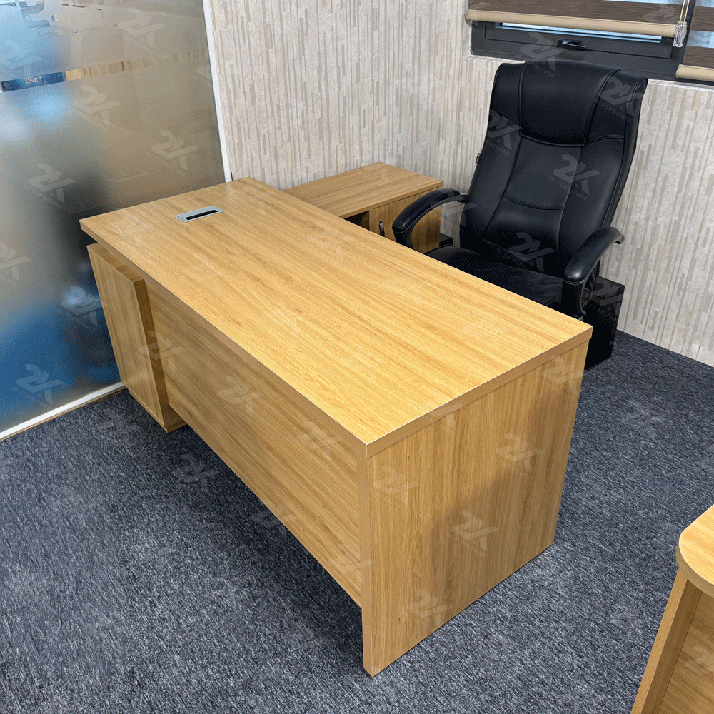 Bàn giám đốc thiết kế tối giản, tông màu trung tính vân gỗ, kích thước tối ưu cho văn phòng không gian hạn chế , kiểu dáng chữ L có khoang để đồ, hồ sơ tiện dụng