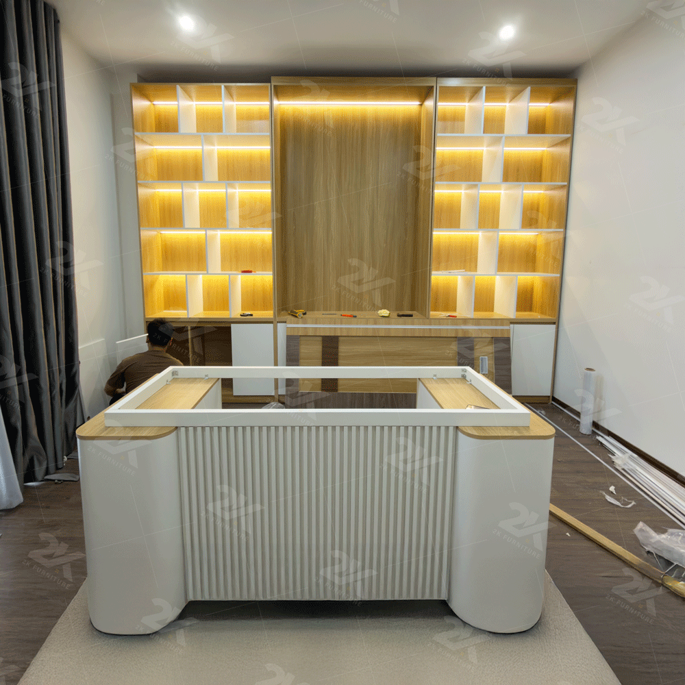 Bàn giám đốc và hệ tủ kệ lưu trữ sang trọng, khẳng định vị thế lãnh đạo.