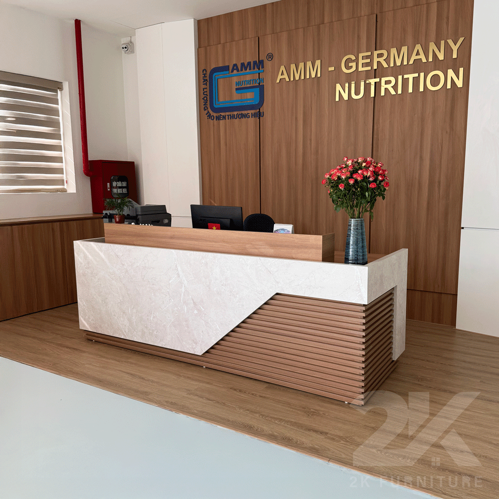 Bàn lễ tân được thiết kế theo phong cách hiện đại, sử dụng vật liệu bền đẹp, đảm bảo tính thẩm mỹ và công năng sử dụng.