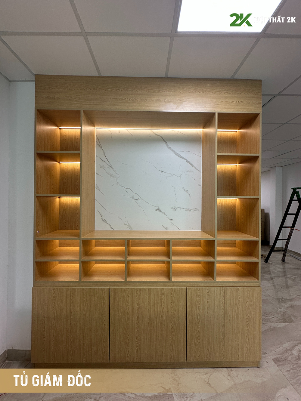 Điểm nhấn nổi bật của tủ là mảng hậu ốp giả đá vân mây dạng tấm lớn, kết hợp hệ thống đèn LED hắt sáng âm tủ, tạo hiệu ứng chiều sâu sang trọng và hiện đại. Thiết kế này không chỉ có giá trị thẩm mỹ mà còn giúp khu vực giám đốc trở nên ấn tượng, có điểm nhìn nổi bật.