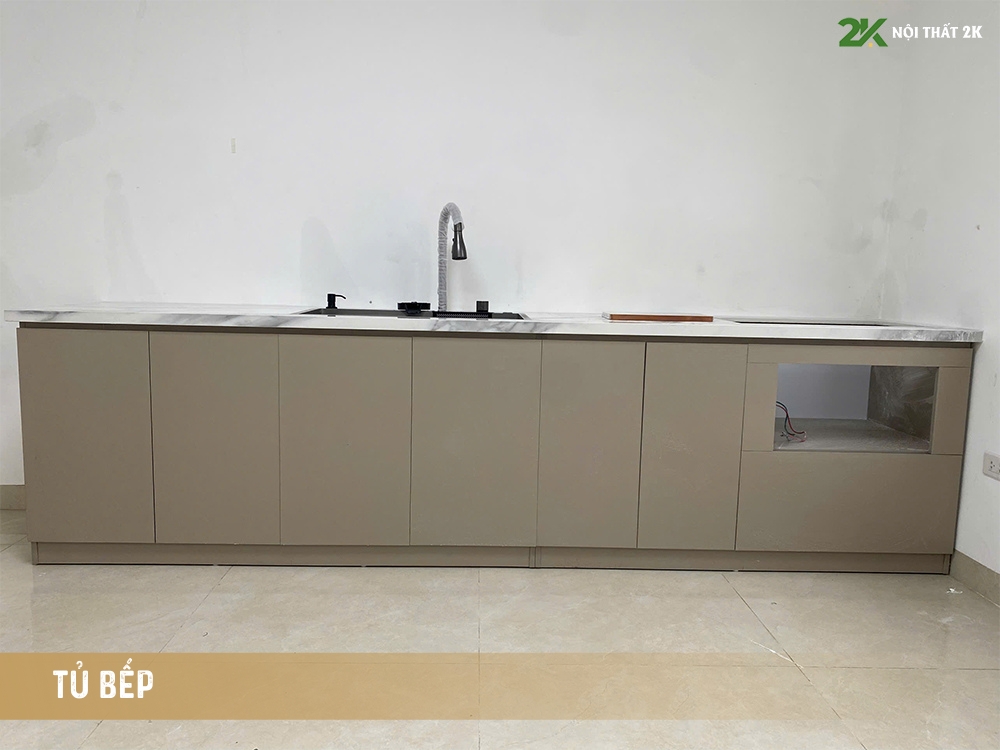 Chất liệu sử dụng là MDF lõi xanh chống ẩm, phủ bề mặt Laminate nhẵn màu xám nhạt, giúp tủ chống trầy xước và dễ vệ sinh. Mặt bàn bếp ốp đá công nghiệp vân mây, mang lại cảm giác sạch sẽ, sang trọng và chống thấm hiệu quả.