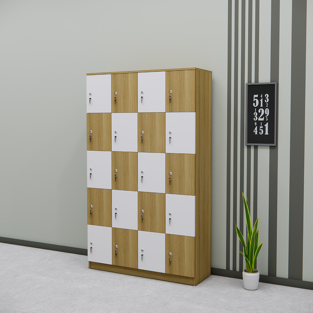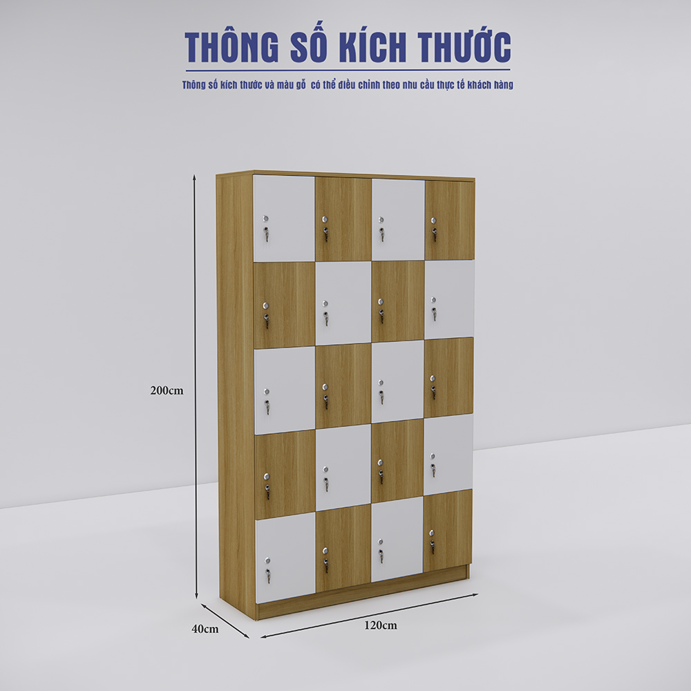 Tủ locker 2KTLK03 là dòng tủ gỗ cao cấp với thiết kế gồm 20 ngăn chia thành 4 hàng dọc, mỗi hàng 5 ngăn. Sản phẩm được sản xuất từ chất liệu gỗ MFC phủ Melamine cao cấp, đảm bảo độ bền, khả năng chống ẩm mốc và trầy xước tối ưu.