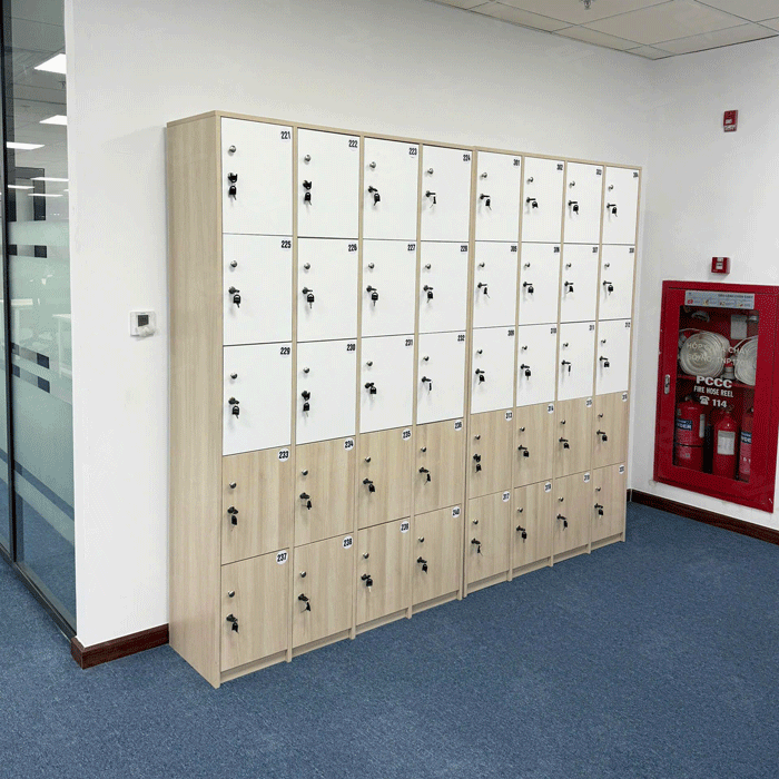 Mẫu tủ locker này được làm từ gỗ MFC phủ Melamin, một chất liệu gỗ công nghiệp hiện đại, có khả năng chống trầy xước, chống ẩm mốc và mối mọt hiệu quả. Bề mặt Melamin không chỉ tạo độ bền cho sản phẩm mà còn giúp tủ có vẻ ngoài bóng mượt, dễ vệ sinh và bảo quản. Chất liệu này đảm bảo độ bền lâu dài và mang lại tính thẩm mỹ cao cho không gian sử dụng.
