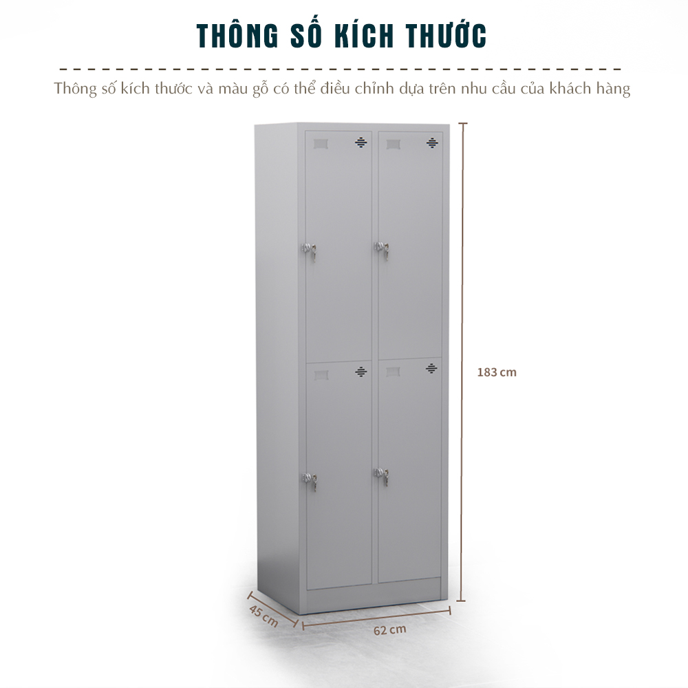 Tủ locker sắt 2KK4R623 liền khối sơn tĩnh điện với thiết kế 4 khoang lưu trữ độc lập, chất liệu bền bỉ và khóa an toàn là lựa chọn hoàn hảo cho những ai cần một giải pháp lưu trữ thông minh, bảo mật và tiện lợi trong môi trường làm việc hoặc học tập.