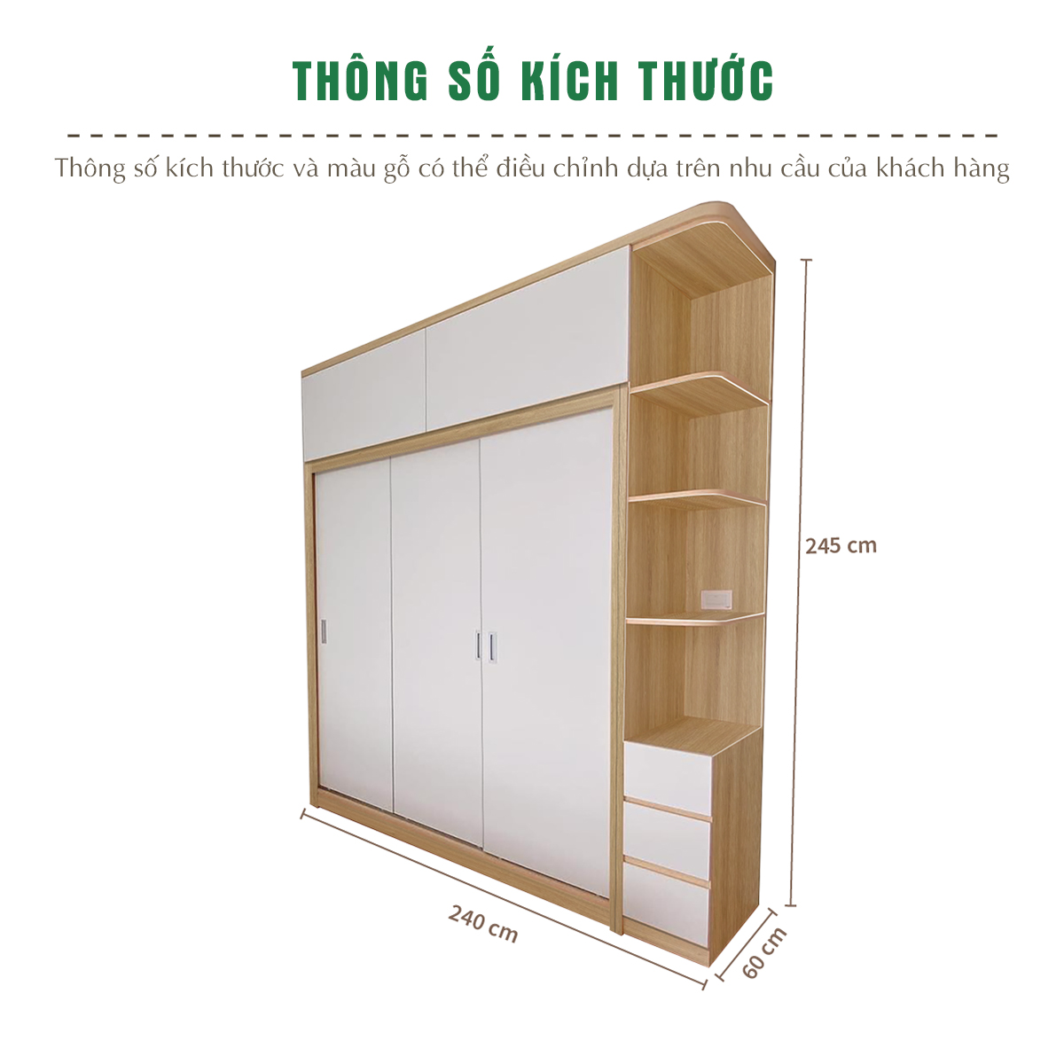 Với kích thước dài 240cm, cao 245cm và sâu 60cm, tủ quần áo TQA02 cung cấp không gian lưu trữ rộng rãi và thoải mái. Thiết kế thông minh với các ngăn kéo, kệ và giá treo đồ đa năng giúp bạn dễ dàng sắp xếp và tổ chức quần áo, giày dép và phụ kiện một cách khoa học và ngăn nắp.