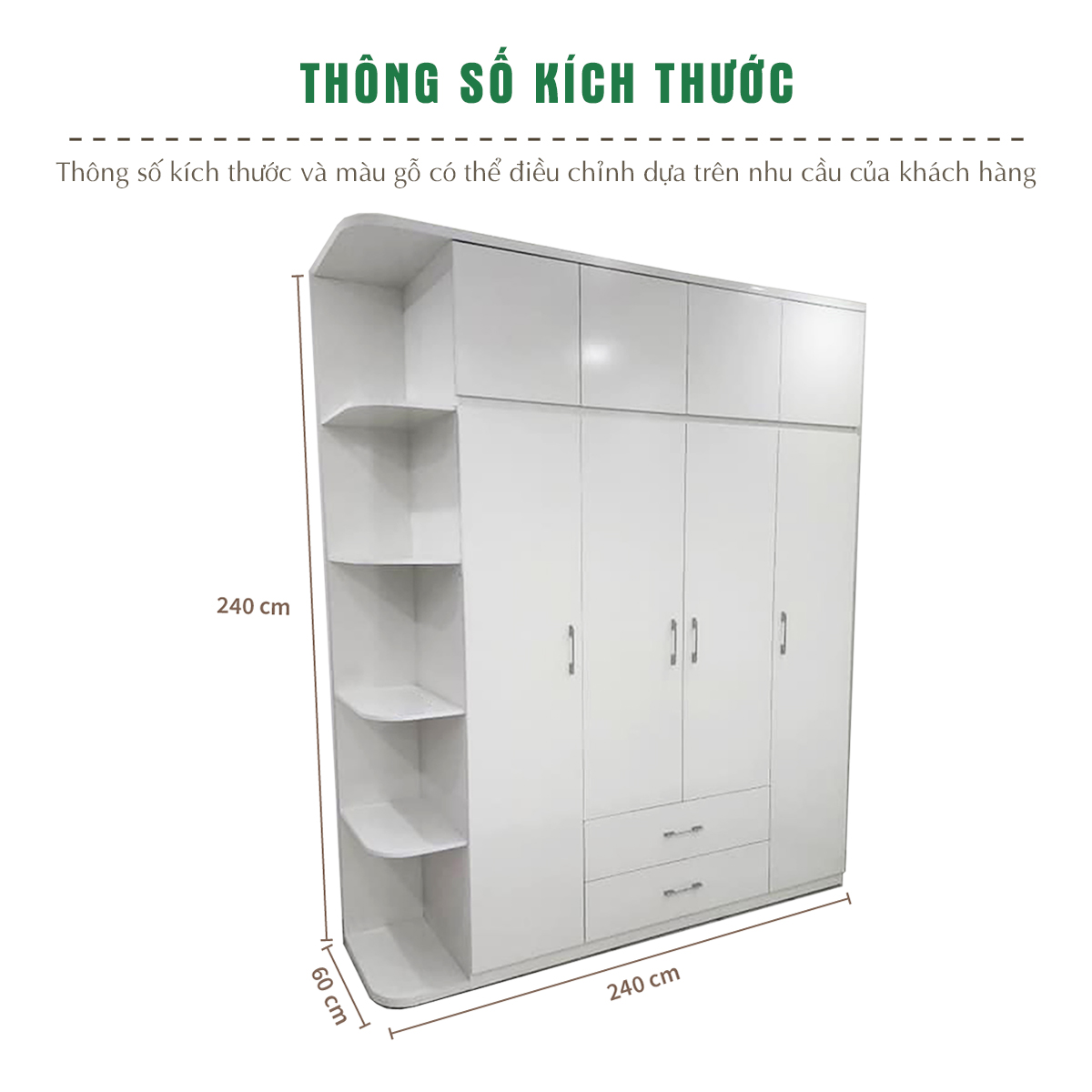 Với kích thước dài 240cm, cao 240cm và sâu 60cm, tủ quần áo TQA03 cung cấp không gian lưu trữ rộng rãi, giúp bạn dễ dàng sắp xếp và bảo quản quần áo, giày dép và phụ kiện một cách ngăn nắp. Thiết kế thông minh với các ngăn kéo và kệ đa năng tối ưu hóa công năng sử dụng, mang đến sự tiện lợi trong việc lưu trữ.
