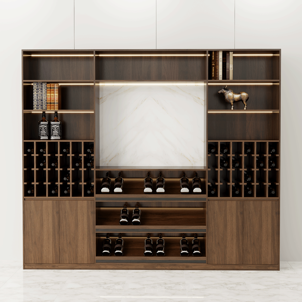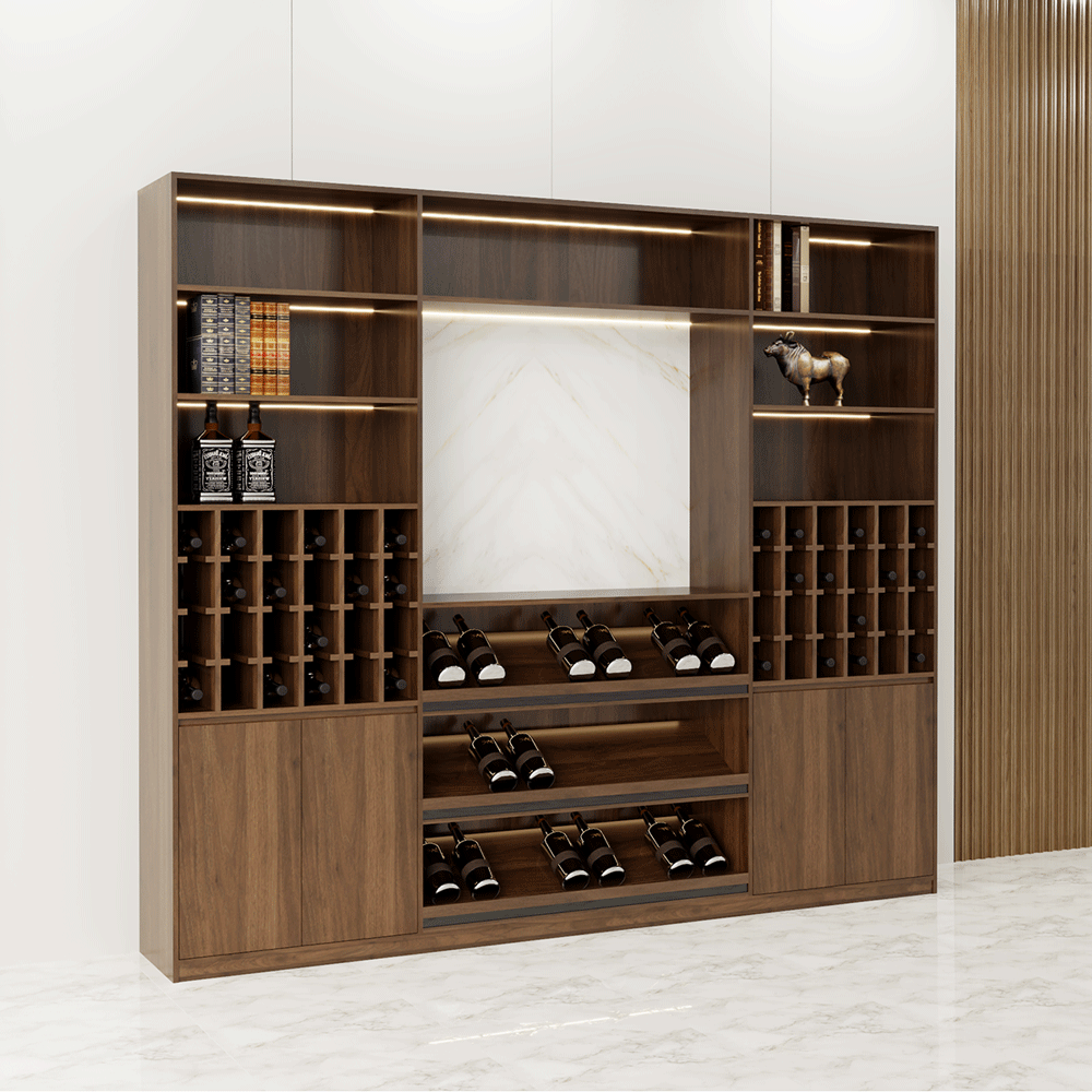 Tủ được chia bố cục khoa học với kệ để rượu ngang – hộc rượu tổ ong – ngăn trưng bày sách và decor, kết hợp đèn LED âm kệ tạo hiệu ứng ánh sáng ấm, làm nổi bật bộ sưu tập rượu và vật trang trí.