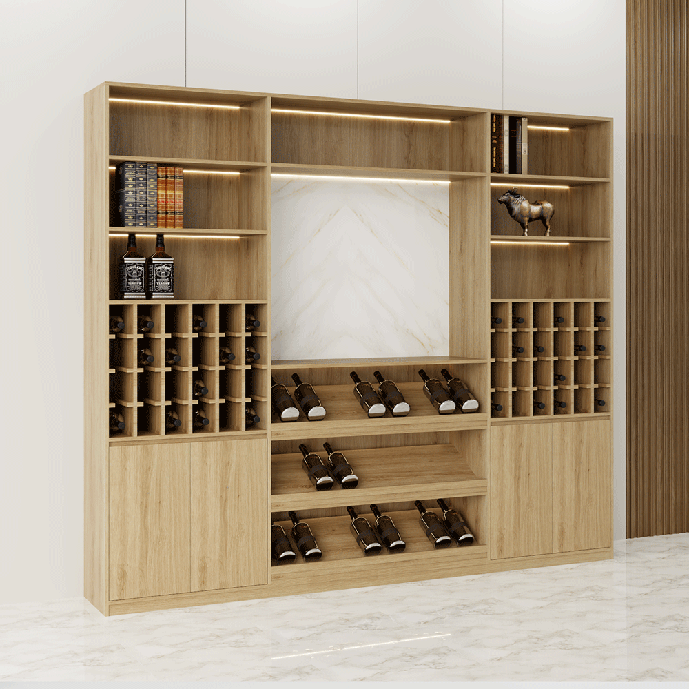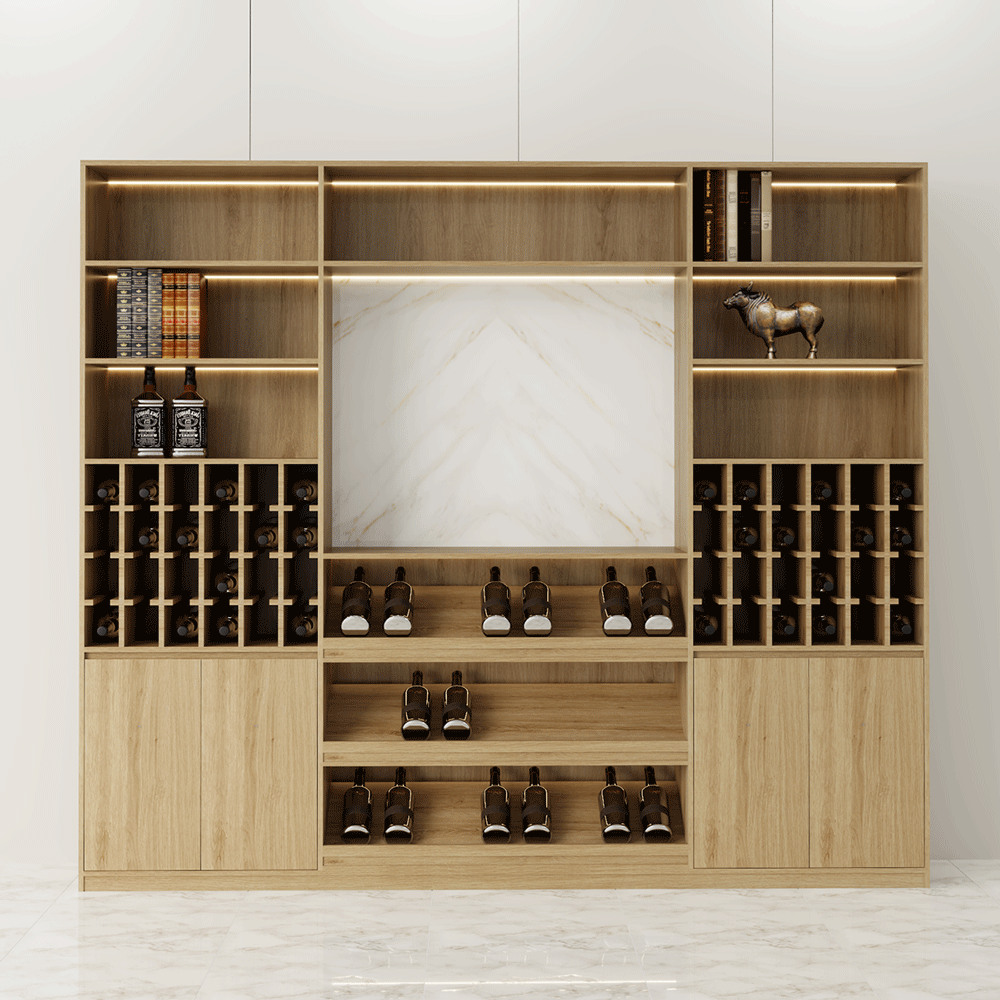 Tủ được chia bố cục khoa học với kệ để rượu ngang – hộc rượu tổ ong – ngăn trưng bày sách và decor, kết hợp đèn LED âm kệ tạo hiệu ứng ánh sáng ấm, làm nổi bật bộ sưu tập rượu và vật trang trí.